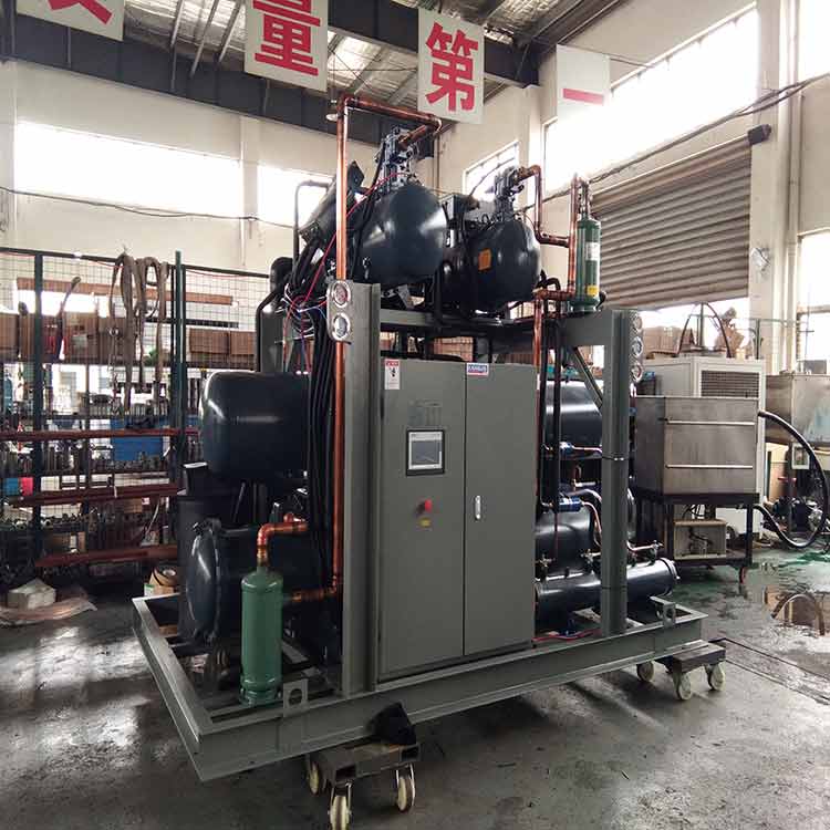 2.三元復(fù)疊低溫冷凍機(jī)組:其由高溫級(jí)(R404A/R22)、低溫級(jí)R23、超低溫級(jí)(R14)組合而成,最低可提供-120℃超低溫工藝?yán)湓础C(jī)組制冷量范圍為3kw~300kw;